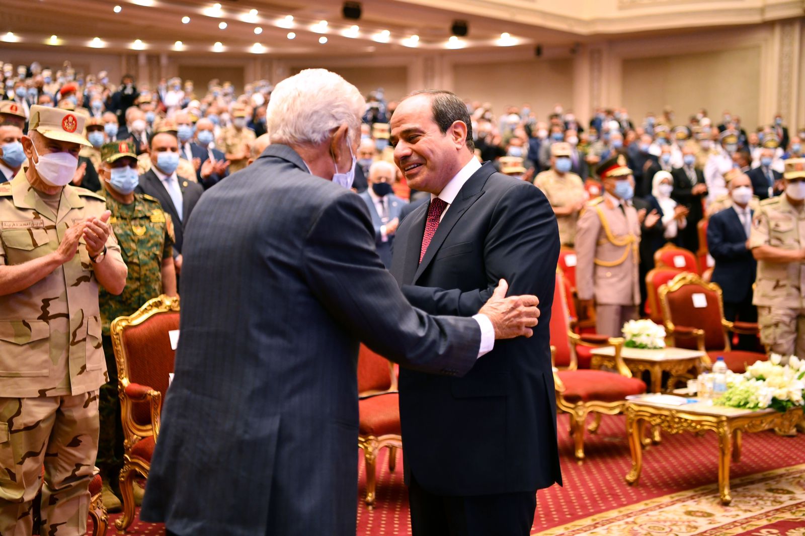 ورحب الرئيس السيسي في بداية الاحتفال بالفريق عبد رب النبي حافظ أحد أبطال حرب أكتوبر.