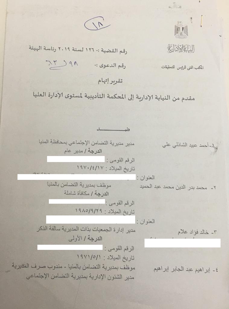 كشف تقرير قضائي صادرة عن المكتب الفني لرئيس هيئة النيابة الإدارية في القضية رقم 98 لسنة 63 قضائية عليا عن وقائع فساد مالي وإداري وأخلاقي جديدة خلال الفترة من شهر ديسمبر 2018 وحتى أغسطس 2019، ترتب عليها الاستيلاء على أموال وزارة التضامن الاجتماعي، أحيل على إثرها وكيل وزارة و3 مسئولين آخرين للمحاكمة العاجلة.