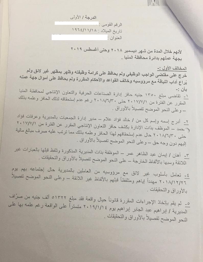 كما أهان إيمان عبد الظاهر عمر، الموظفة بذات المديرية وتلفظ قبلها بعبارات غير لائقة وسبها بالألفاظ الخارجة، وتعامل بأسلوب غير لائق مع مرؤوسيه من العاملين بالمديرية أثناء اجتماعه بهم يوم 26 ديسمبر 2018 مهددًا إياهم ومتلفظًا قبلهم بالألفاظ غير اللائقة، ولم يقم باتخاذ الإجراءات المقررة قانونًا حيال واقعة فقد مبلغ 51322 جنيه من صراف المديرية إبرهيم عبد الجابر إبراهيم يوم 14 يناير عام 2019 متسترًا على الواقعة رغم علمه بها.