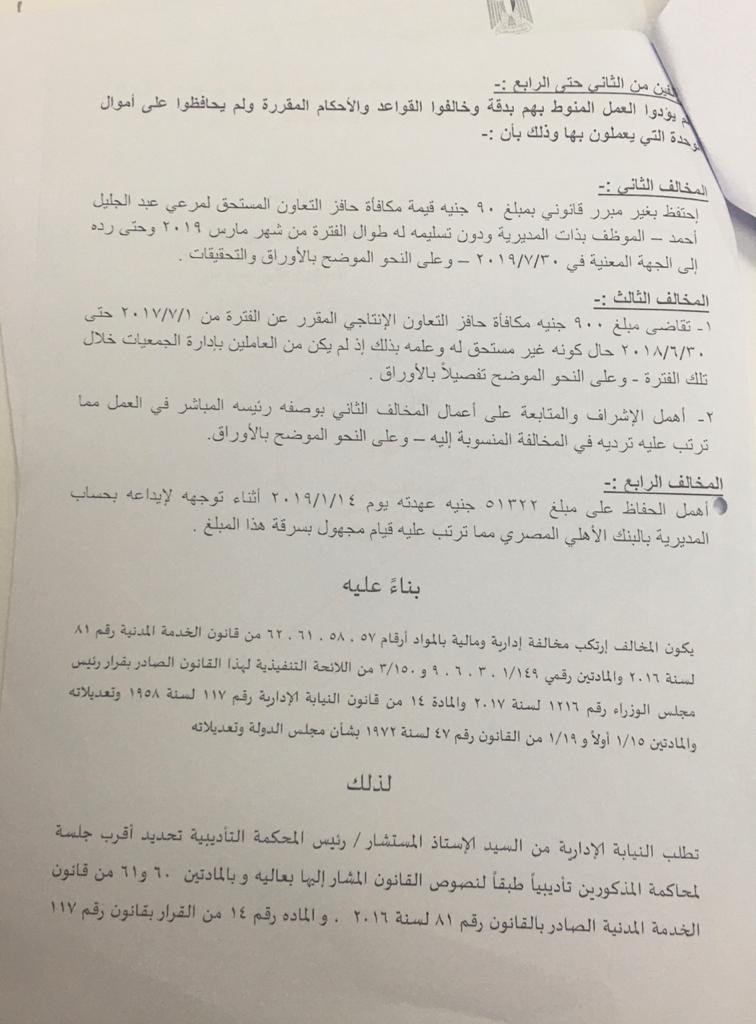 وأدرج اسمه واسم كل من خالد فؤاد علام، مدير إدارة الجمعيات بالمديرية وعرفات فؤاد محمد، الموظف بذات الادارة بكشف حافز التعاون الانتاجى المقرر عن ذات الفترة رغم عدم استحقاقهم لهذا الحافز مما ترتب عليه صرف مبالغ مالية اليهم دون وجه حق.