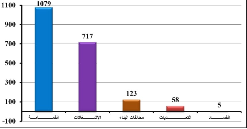 وأوضح شعراوي أن شكاوى المواطنين التى تلقتها المبادرة خلال شهر سبتمبر الماضى تنوعت مابين شكاوى للقمامة والتى بلغ عددها 1079 شكوى والإشغالات 717 شكوى ومخالفات البناء 123 شكوى والتعديات على الأراضى الزراعية وأملاك الدولة 58 شكوى والفساد 5 شكاوى اضافة الى 23 شكوى خاصة بمبادرة "حياة كريمة" مؤكدًا أن متابعة حل شكاوى المواطنين وتحقيق رضاهم عن الخدمات المقدمة إليهم بكافة المحافظات هو أحد أهم محاور تقييم عمل قيادات الإدارة المحلية.