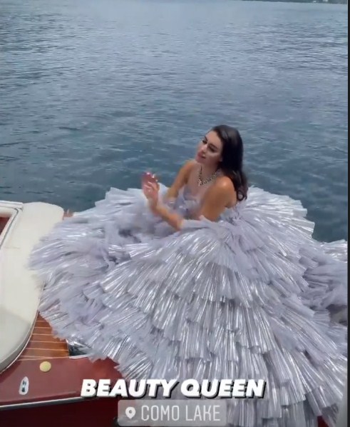 وجابت بحيرة كومو في رحلة بحرية مع كارتييه، على متن يخت وارتدت فستانٍ ضيّقٍ بحدود الركبة مطبّعٍ بالورود الكبيرة، وهو مكشوف الصدر بتفصيل الدانتيل الأبيض، وبدون أكمام، تقدّر قيمته بـ 1396 جنيهًا إسترلينيًا، مع سترة مزدوجة الصدر بلون الرمادي الفاتح مزيّنة بأزرار ذهبيّة كبيرة من بالمان قيمتها 2171 دولارًا أمريكيًا.