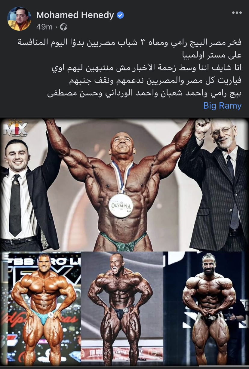 ونشر محمد هنيدي صورًا لنجوم مصر المشاركين في البطولة وعلق عليها قائلًا: "فخر مصر البيج رامي ومعاه ٣ شباب مصريين بدأوا اليوم المنافسة على مستر أوليمبيا.. أنا شايف إننا وسط زحمة الأخبار مش منتبهين ليهم أوي.. فياريت كل مصر والمصريين ندعمهم ونقف جنبهم.. بيج رامي وأحمد شعبان وأحمد الورداني وحسن مصطفى".