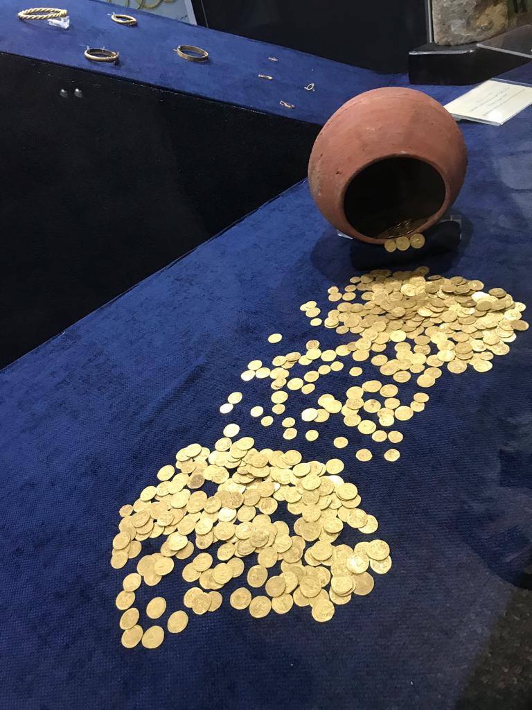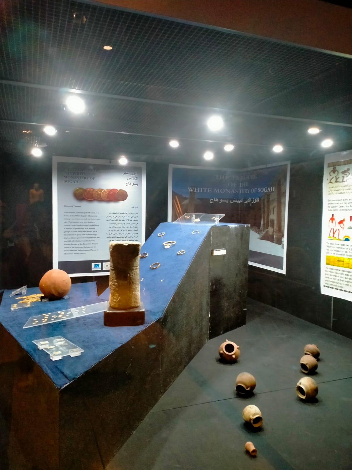 ويضم المعرض ايضا 690 عمله أثرية ترجع إلى عصور الامبراطورية الرومانية والبيزنطية عثر عليها بحفائر الدير الابيض بسوهاج، و4 دينارات ذهبية من العصر الأموي كتب علي الوجه الأول لكل منها "لا اله الا الله وحدة لا شريك له" في وسطه على الاطار الخارجي "محمد رسول الله ارسله للهدى ودين الحق ليظهره على الدين كله" وعلى الوجة الاخر في الوسط "كتب الله احد الله الصمد لم يلد ولم يولد" وعلى الاطار الخارجي "بسم الله"، ونصفين دينار من الذهب من العصر الأموي هذا النصف 99 هجرية علي الوجه الاول "لا اله الا الله وحده" وعلى الوجه الاخر "بسم الله الرحمن الرحيم" في الوسط وعلى الاطار الخارجي "محمد رسول الله ارسله للهدي ودين الحق" عثر عليهما بدير ماري جرجس ( المجمع ) حاجز الصوص بنقادة.
