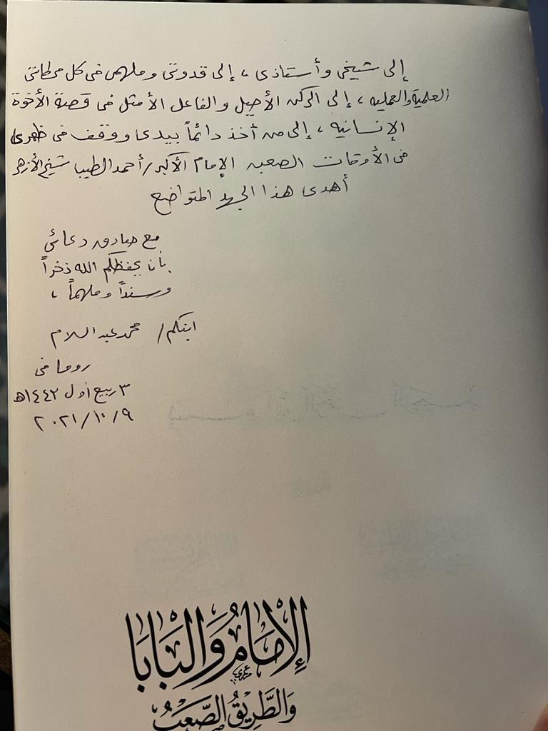 وأهدى عبد السلام، الإمام الطيب نسخة من كتابه (الإمام والبابا والطريق الصعب)، لافتا إلى أن هذه النسخة تمثل الطبعة الثانية المزيدة والمنقحة باللغة العربية، مؤكدا أنه دون في كتابه الدور البارز للأزهر الشريف وشيخه الإمام الأكبر في مسيرة الأخوة الإنسانية، وحرص الإمام الأكبر على تخطي الحواجز وفتح قنوات الحوار والتواصل مع المؤسسات الدينية بالعالم