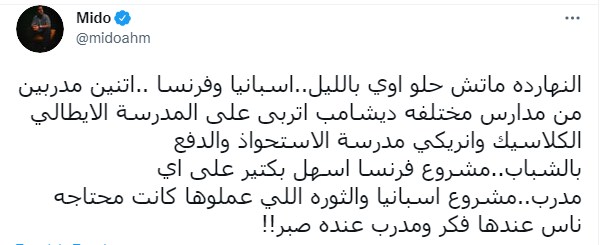 وكتب أحمد حسام "ميدو" تغريدة على تويتر قال فيها: "النهاردة ماتش حلو اوي بالليل.. إسبانيا وفرنسا.. اتنين مدربين من مدارس مختلفة ديشامب اتربي على المدرسة الإيطالي الكلاسيك وانريكي مدرسة الاستحواذ والدفع بالشباب.. مشروع فرنسا اسهل بكتير على أي مدرب.. مشروع إسبانيا والثورة اللي عملوها كانت محتاجة ناس عندها فكر ومدرب عنده صبر!!"