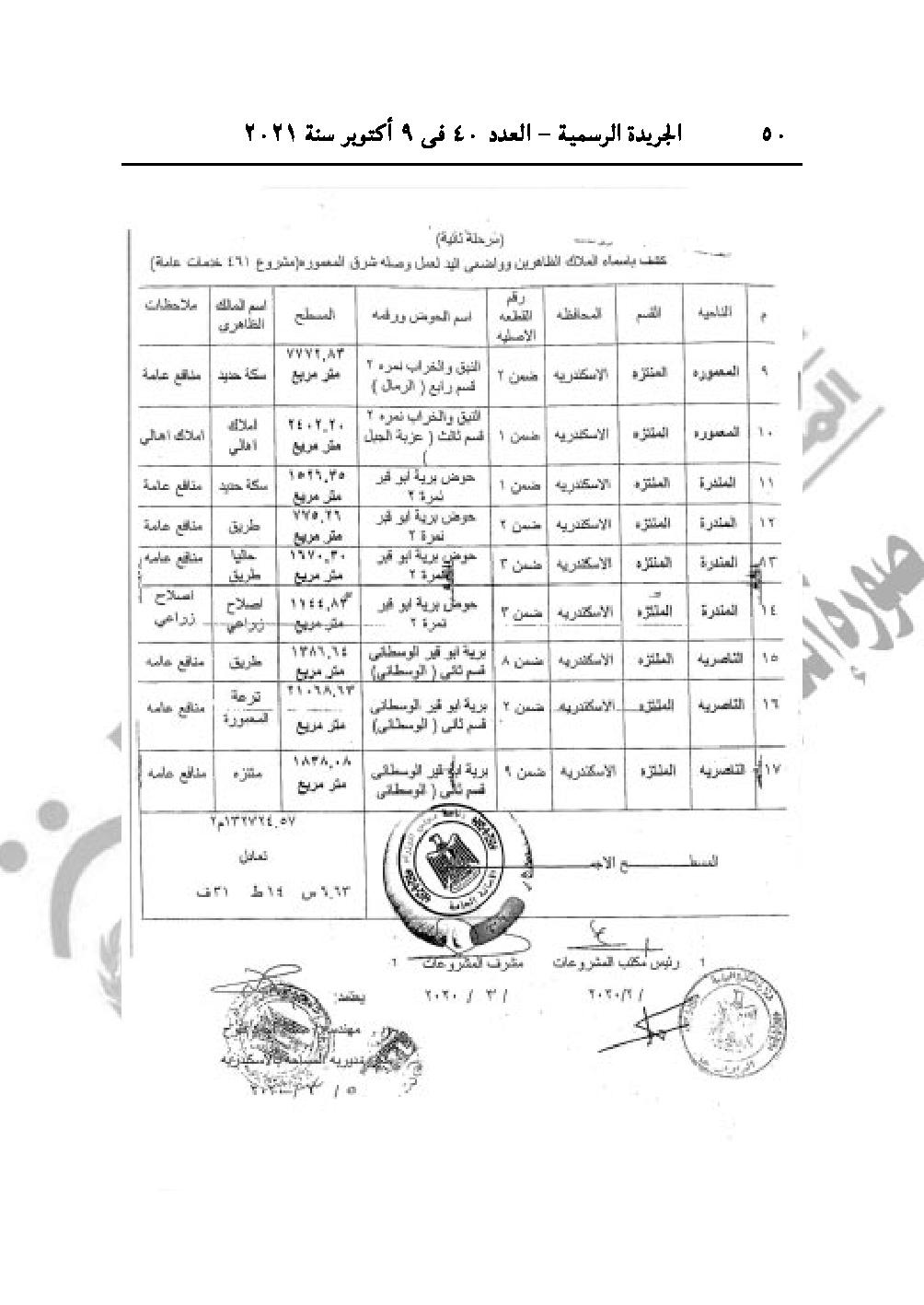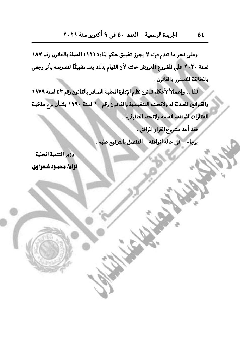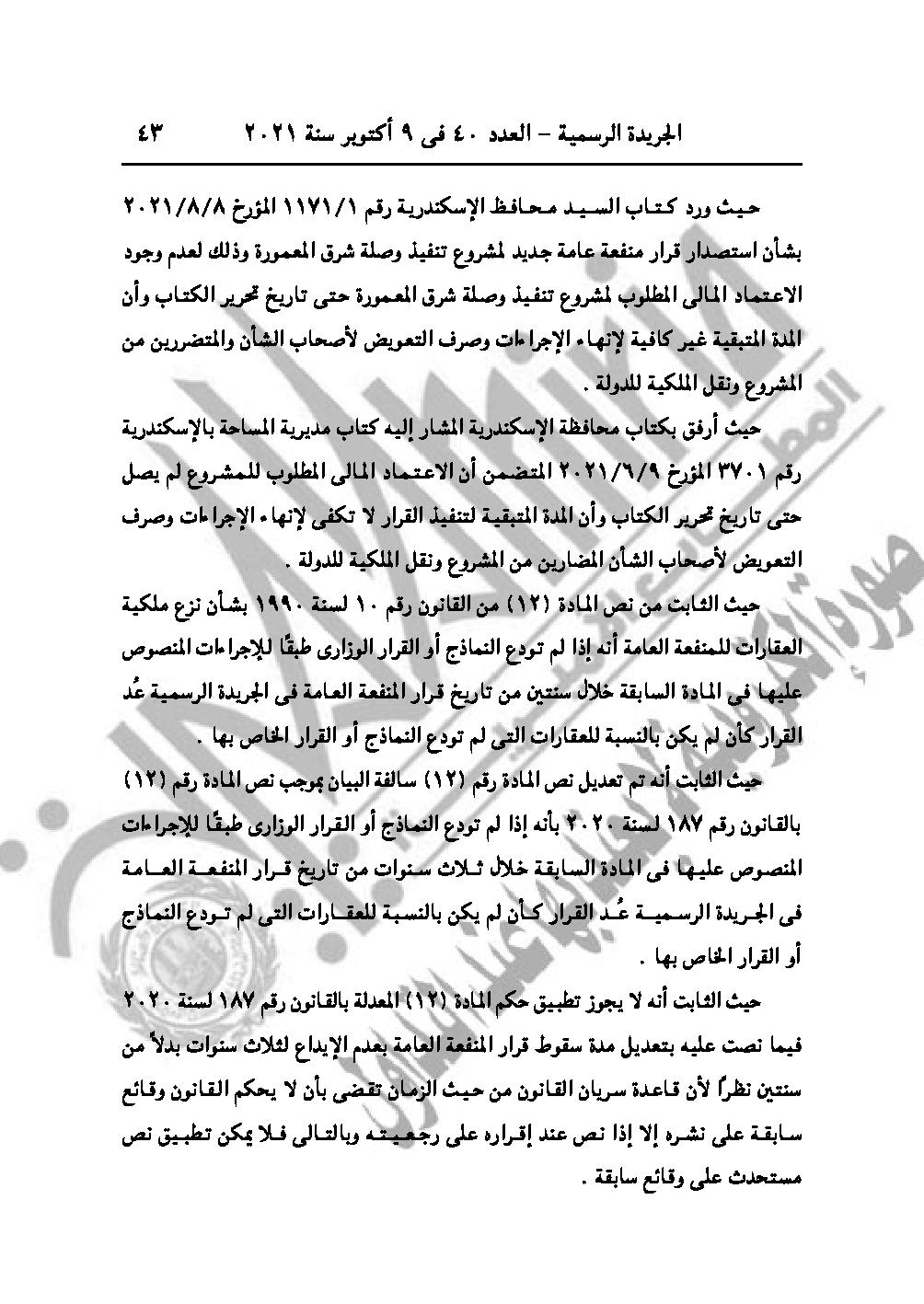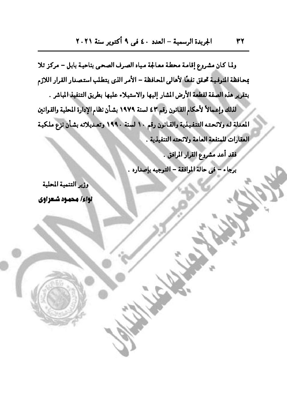 نشرت الجريدة الرسمية في عددها رقم 40، الصادر في 9 أكتوبر 2021، 3 قرارات لرئيس مجلس الوزراء الدكتور مصطفى مدبولي، باعتبار مشروع إقامة محطة معالجة مياه الصرف الصحى بالمنوفية، وتنفيذ وصلة شرق المعمورة من أعمال المنفعة العامة، بالإضافة لمنح الجنسية المصرية لثلاث سوريين وليبي.