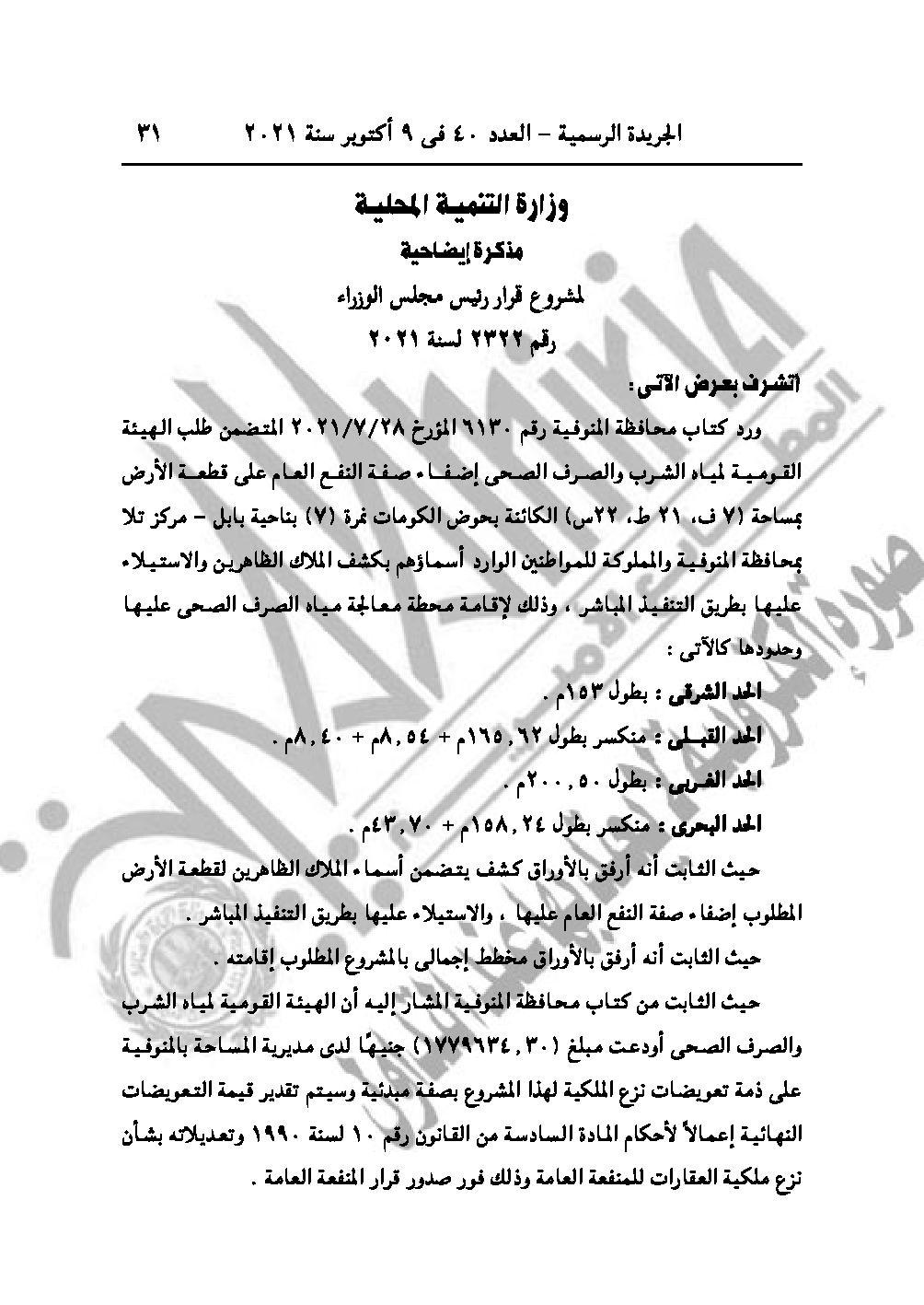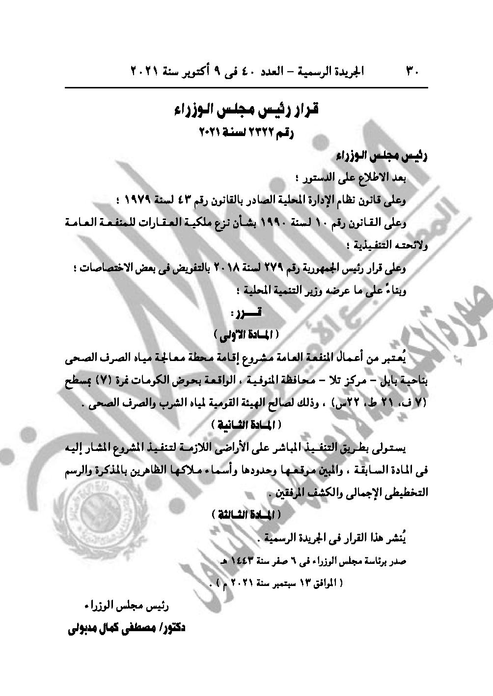 القرار رقم 2322 لسنة 2021، باعتبار مشروع إقامة محطة معالجة مياه الصرف الصحى بناحية بابل، مركز تلا محافظة المنوفية، من أعمال المنفعة العامة.