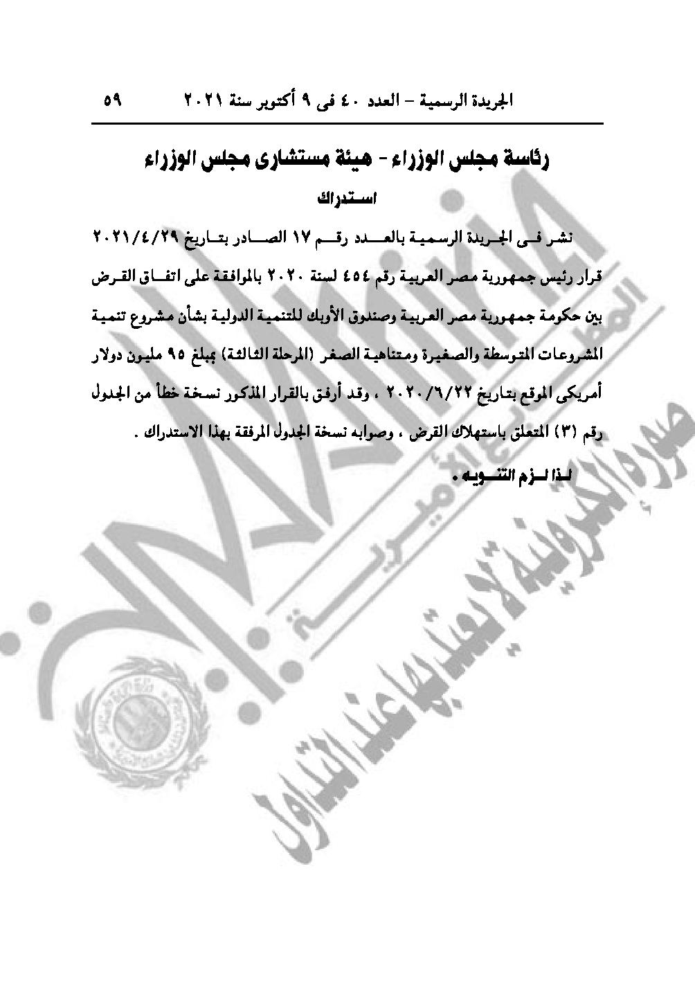 كما نشرت الجريدة استدراك لقرار رئيس جمهورية مصر العربية رقم 454 لسنة 2020 المنشور في الجريدة الرسمية بالعدد رقم 17 الصادر بتاريخ 29/4/2021.