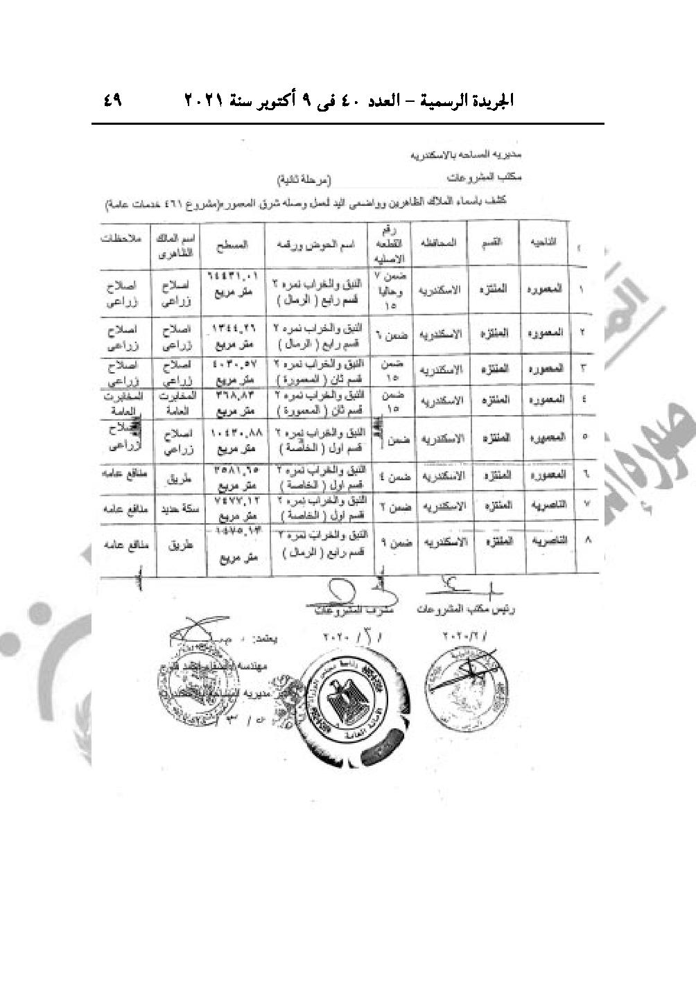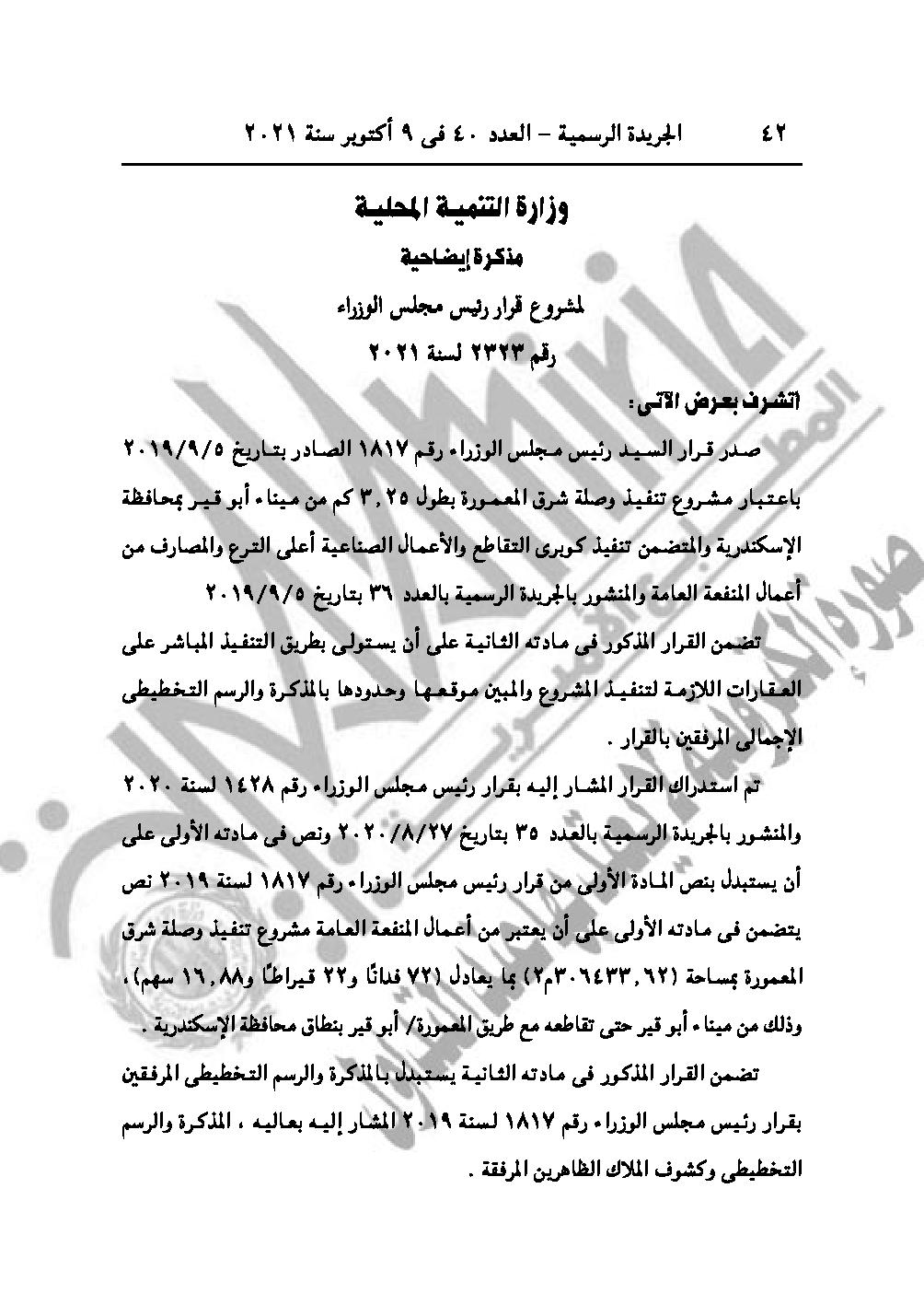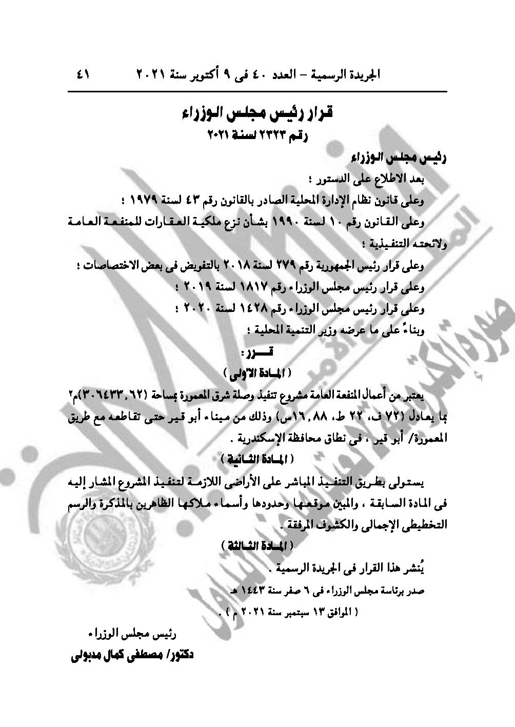 والقرار رقم 2323 لسنة 2021، باعتبار مشروع تنفيذ وصلة شرق المعمورة وذلك من ميناء أبو قير، حتى تقاطعه مع طريق المعمورة/ أبو قير، في نطاق محافظة الإسكندرية من أعمال المنفعة العامة.