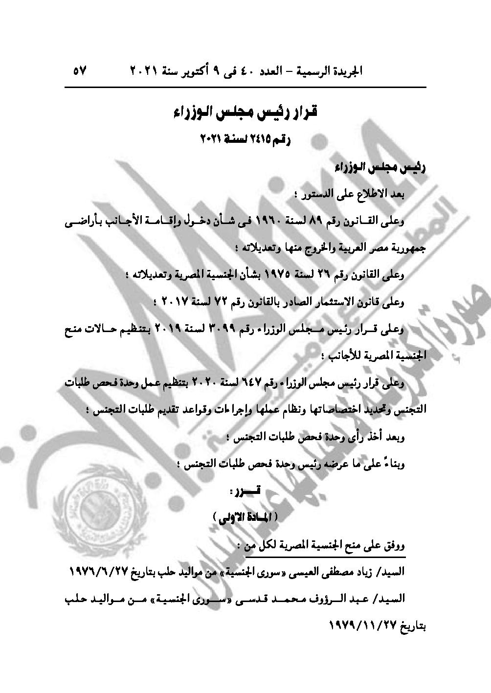 والقرار رقم 2415 لسنة 2021، بالموافقة على منح الجنسية المصرية لبعض الأشخاص.