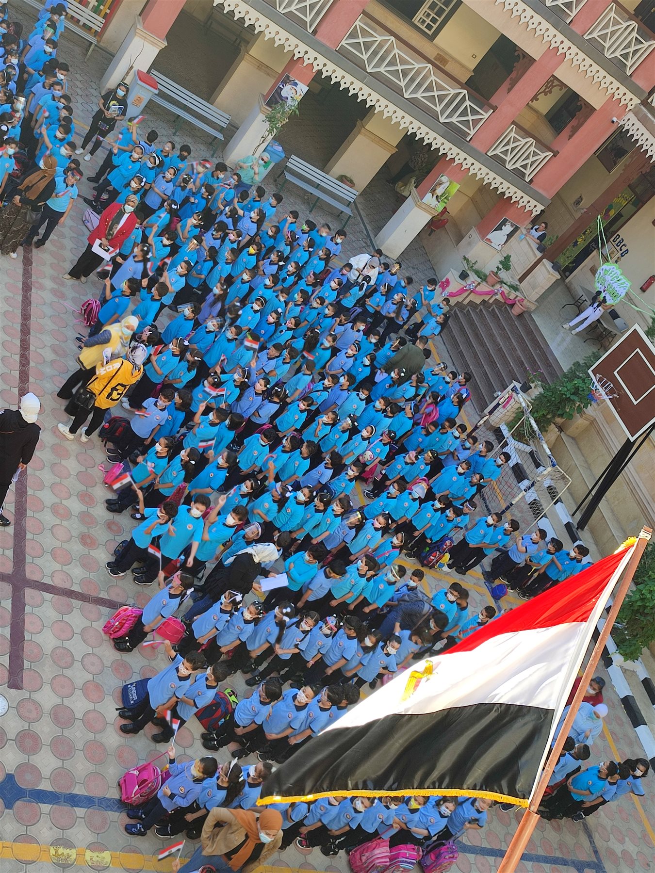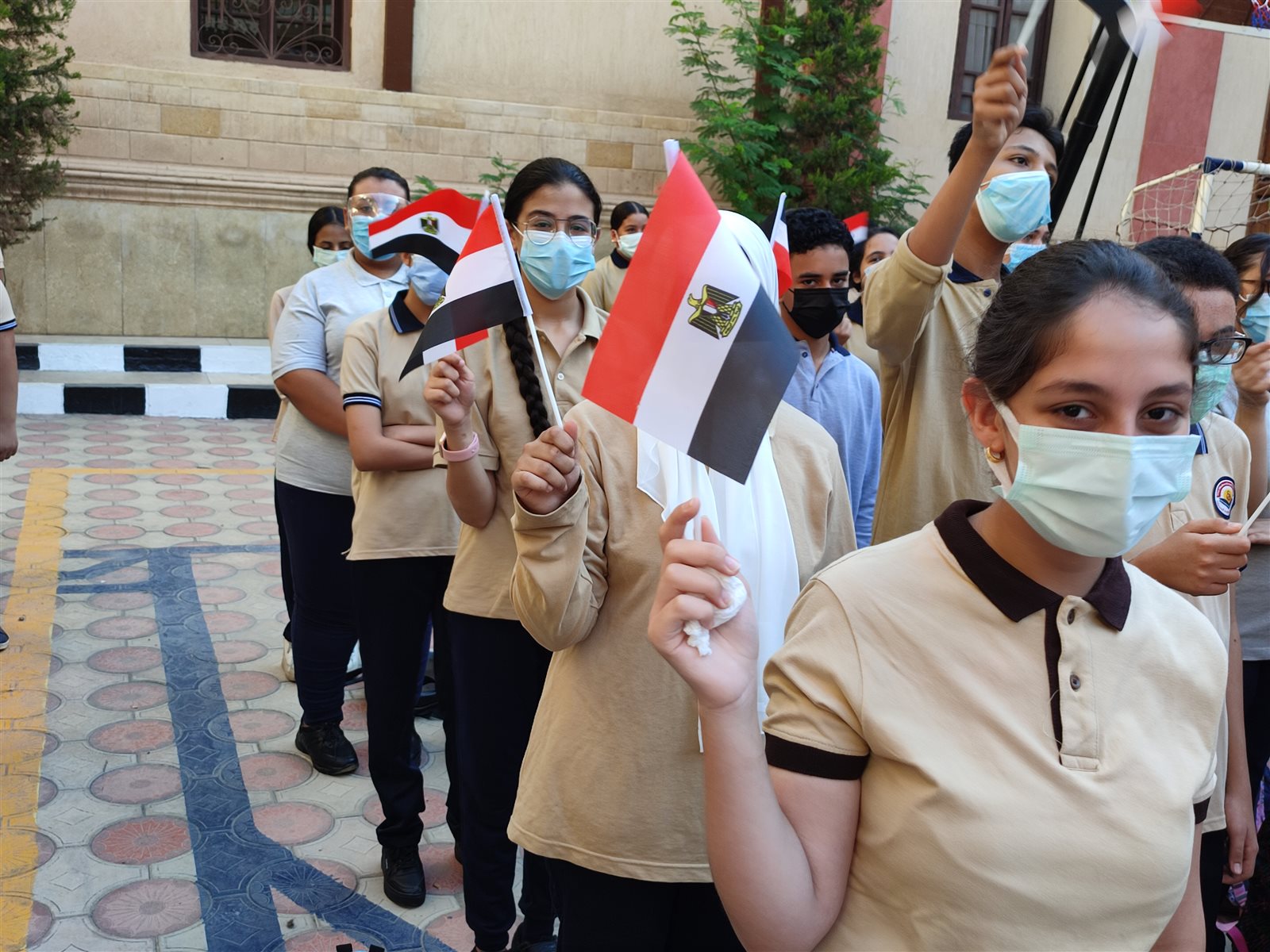 وتضمن طابور الصباح عددا من الأغاني الوطنية الحماسية، كما رفع طلاب المرحلتين الابتدائية والإعدادية بالمدرسة أعلام مصر عاليا على نغمات اغنية " عاشت بلادنا"، وقاموا بترديد الأغنية معها في أجواء حماسية.