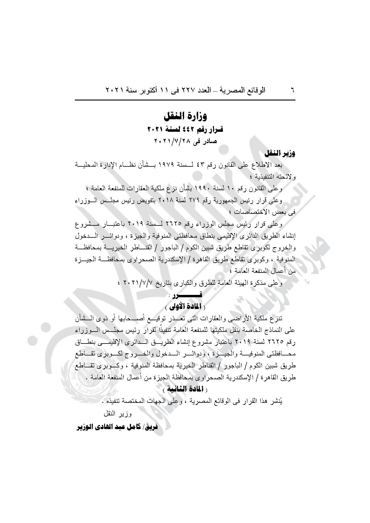 نشرت جريدة الوقائع المصرية في عددها رقم 227، الصادر في 11 أكتوبر 2021، قرار وزارة النقل رقم 442 لسنة 2021، نزع ملكية الأراضي والعقارات التي تعذر توقيع أصحابها أو ذوي الشأن على النماذج الخاصة بنقل ملكيتها للمنفعة العامة.