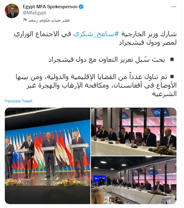 وكتب أحمد حافظ تغريدة على تويتر قال فيها: "شارك وزير الخارجية #سامح_شكري في الاجتماع الوزاري لمصر ودول فيشجراد.. بحث سُبل تعزيز التعاون مع دول فيشجراد.. تم تناول عددًا من القضايا الإقليمية والدولية، ومن بينها الأوضاع في أفغانستان، ومكافحة الإرهاب والهجرة غير الشرعية".