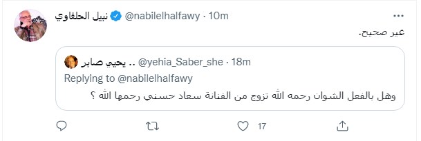 كما حسم الحلفاوي الجدل حول حقيقة زواج أحمد الهوان والمعروف بجمعة الشوان من الفنانة الراحلة سعاد حسني، بالرد على تساؤل أحد المغردين: “وهل بالفعل الشوان رحمه الله تزوج من الفنانة سعاد حسني رحمها الله ؟”، قائلًا: “غير صحيح”.