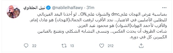 وكتب نبيل الحلفاوي عبر حسابه على موقع التدوينات القصيرة "تويتر": " بمناسبة عرض الهجان على dmc والشوان على ON.. لو أخذنا البعد الفيزيائي للبطلين الأصليين في الاعتبار.. نجد الأقرب لرفعت الجمال (الهجان) هو عادل إمام. والأقرب لأحمد الهوان (الشوان) هو محمود عبد العزيز.. شاءت الظروف أن يحدث العكس.. وننسى التشابه الشكلي ونقتنع بالفنانين الكبيرين كل في دوره".
