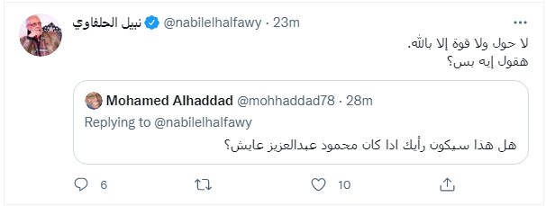 وانتقد آخر تغريدة الحلفاوي، معلقًا: " هل هذا سيكون رأيك إذا كان محمود عبدالعزيز عايش؟"، ليرد عليه الحلفاوي: " لا حول ولا قوة إلا بالله.. هقول إيه بس؟"، ودافع أحد النشطاء عن وجهة نظر الفنان، قائلُا: " الأستاذ مش بيقول إن تمثيلهم ضعيف بالعكس الأستاذ بيعترف أنهم ممثلين كبار هو بيقول الأقرب إلى الشخصية من حيث الشكل والمظهر مش عيب فيهم ولا حاجة الموضوع أبسط من أن حضرتك تشوفوا بالتعقيد ده".