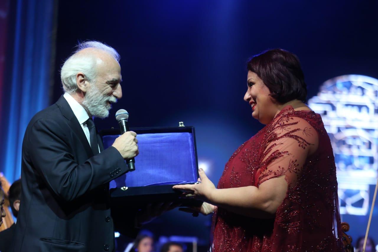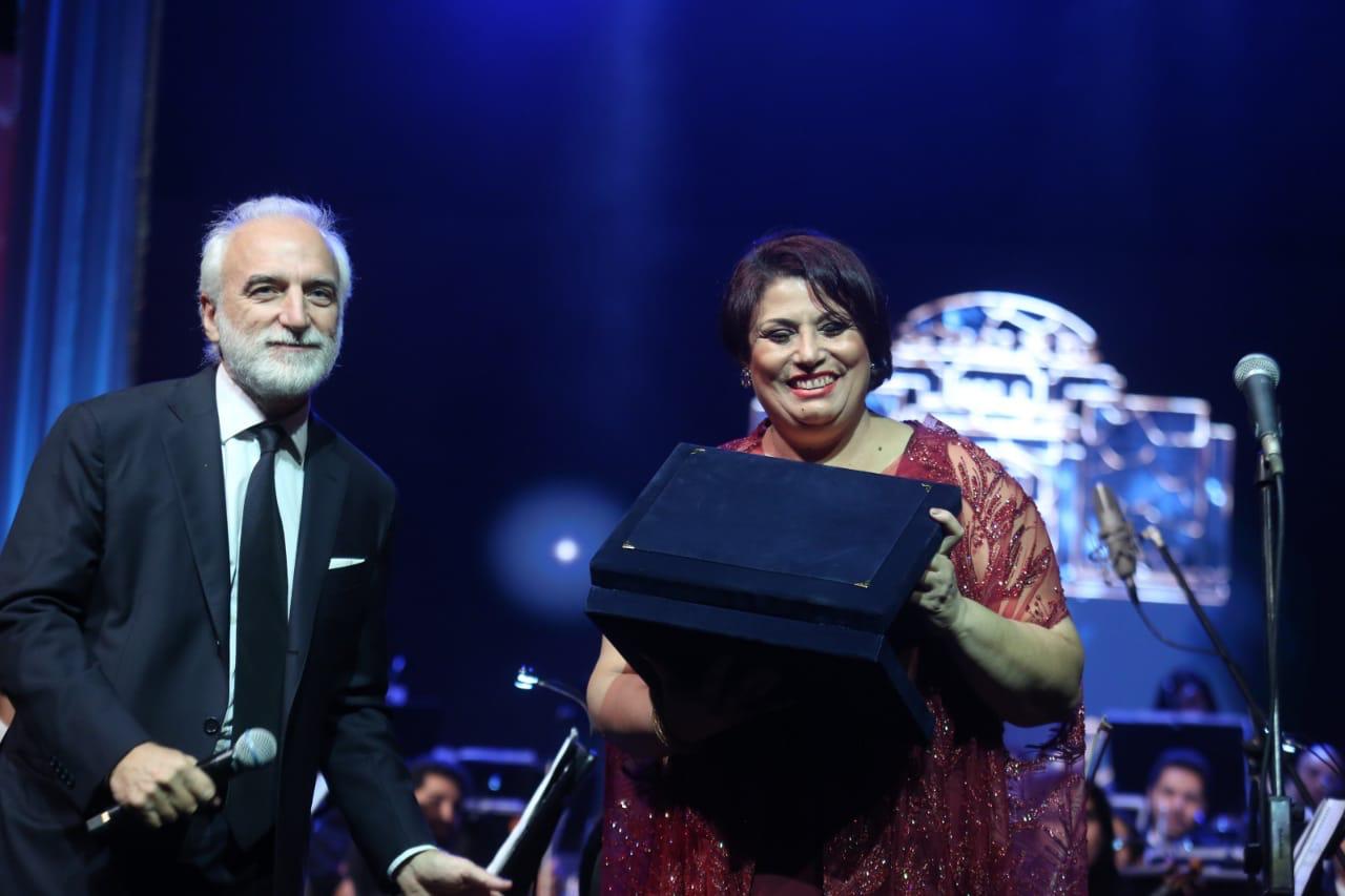 كرم دايفيدي سكالماني، مدير المركز الثقافي الإيطالي والمستشار الثقافي لسفارة بلاده بالقاهرة مغنية الأوبرا العالمية الدكتورة إيمان مصطفى ضمن الاحتفال بعيد ميلاد الأوبرا الـ٣٣ والذي أقيم بالمسرح الكبير.