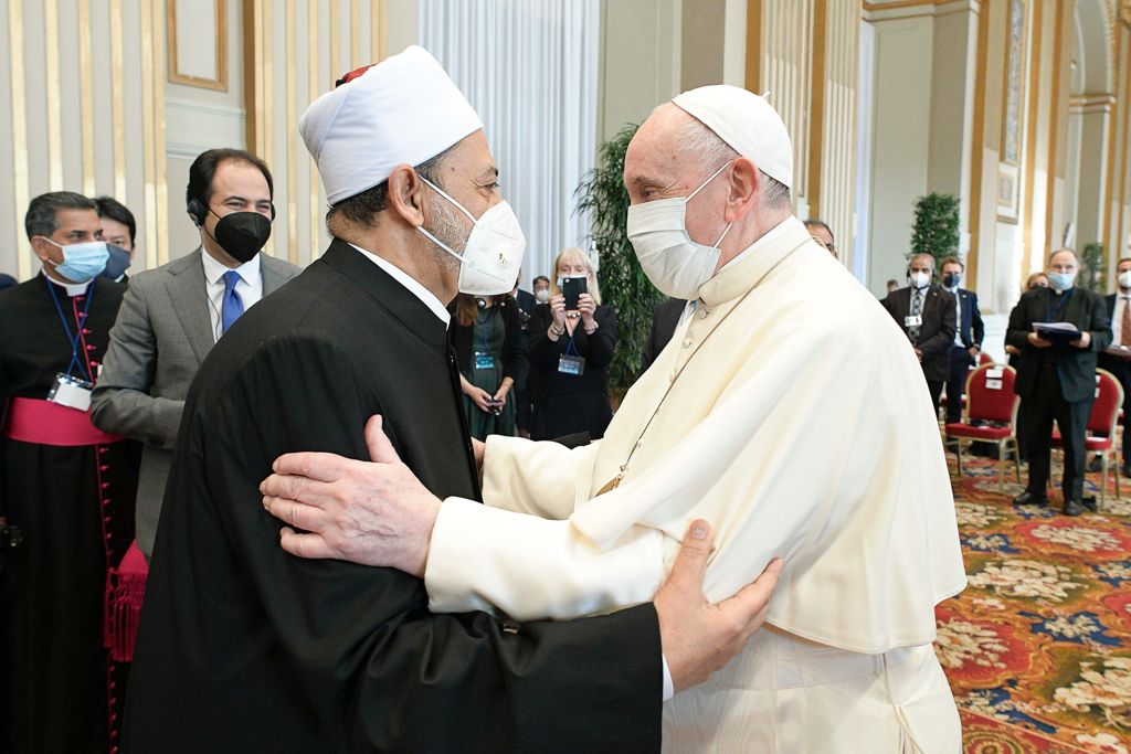 وعقد فضيلة الإمام الأكبر الدكتور أحمد الطيب، شيخ الأزهر الشريف، وقداسة البابا فرنسيس، بابا الكنيسة الكاثوليكية، لقاءً وقمةً خاصةً بحاضرة الفاتيكان، وخلال اللقاء الذي جمعهما، ناقش شيخ الأزهر وبابا الفاتيكان القضايا الدينية والإنسانية والأخلاقية التي تؤرق العالم اليوم، والتحديات التي فرضتها التغيرات والأحداث على الساحة العالمية، والدور الحقيقي الذي يقع على عاتق قادة الأديان وعلماء الدين؛ ليساهموا بدور فعال في التقليل من حدة الاحتراب والانقسام التي تعانيه مناطق متفرقة حول العالم، ومجابهة الأفكار المتطرفة والمخالفة لما نادت به الرسالات السماوية السمحة، وأشاد فضيلة الإمام الأكبر وقداسة البابا فرنسيس بجهود ومبادرات اللجنة العليا للأخوة الإنسانية في تفعيل وترسيخ قيم وثيقة الأخوة الإنسانية من أجل التعايش بين البشر.