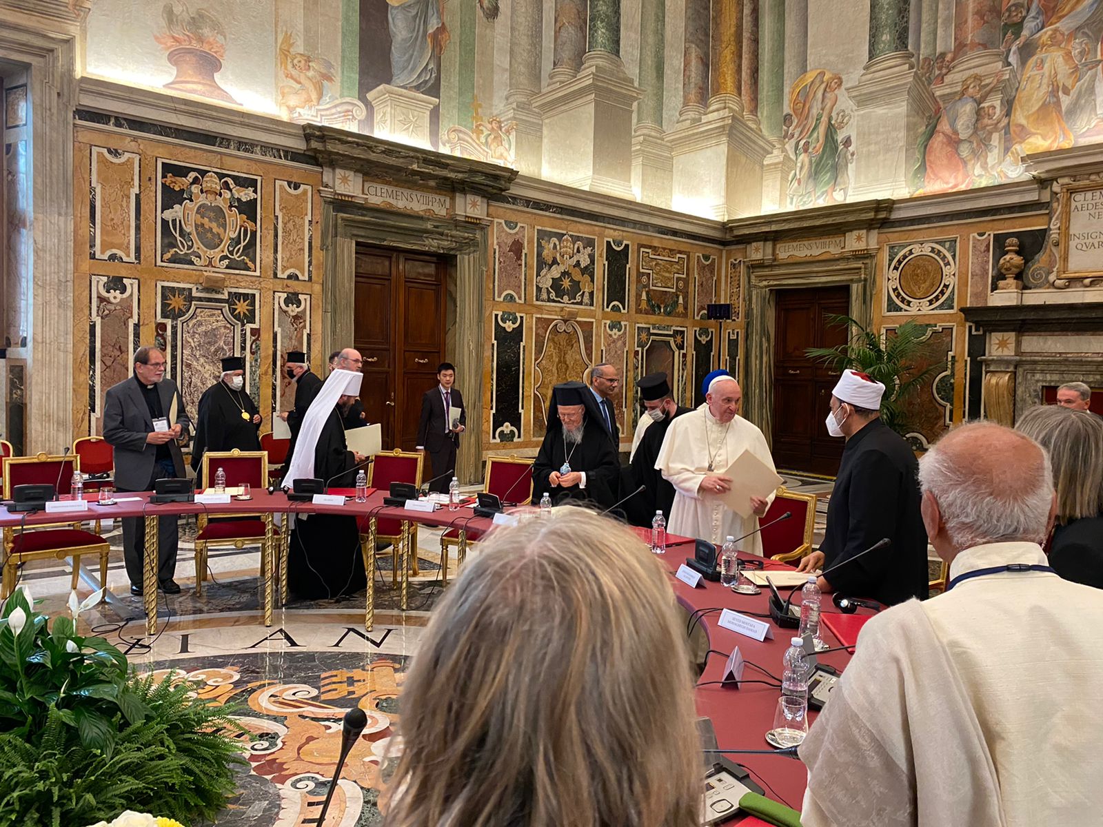 المحطة الأولى للإمام الأكبر، في زيارته العاصمة الإيطالية روما، كانت مشاركته لقادة الأديان في إطلاق نداء مشترك للتحذير من "أزمة غير مسبوقة" بسبب التغير المناخي والتي عقدت في الفاتيكان، تمهيدًا لمؤتمر الأمم المتحدة السادس والعشرين لتغير المناخ.