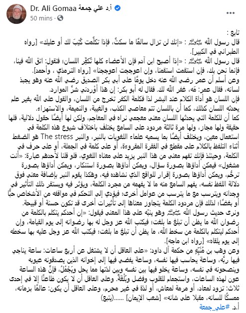 وكتب الدكتور علي جمعة تدوينة على الفيس بوك "قال رسول الله ﷺ: «إنك لن تزال سالمًا ما سكتَّ، فإذا تكلَّمت كُتِبَ لك أو عليك» [رواه الطبراني في الكبير]. قال رسول الله ﷺ: «إذا أصبح ابن آدم فإن الأعضاء كلها تُكفِّر اللسان؛ فتقول: اتق الله فينا، فإنما نحن بك، فإن استقمت استقمنا، وإن اعوججت اعوججنا» [رواه الترمذي، وأحمد].