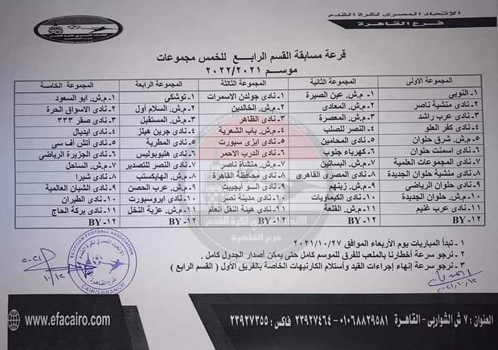 ومن المقرر أن تنطلق منافسات دوري القسم الرابع بمنطقة القاهرة بنظام الدورين لكل مجموعة، على أن تقام التصفية الأخيرة بصعود اول كل مجموعة بنظام الدورين لتحديد المراكز من الأول الى الخامس ثم التصفية على مستوى الفروع لتحديد المتأهلين للقسم الثالث وفقا لائحة اتحاد الكرة.