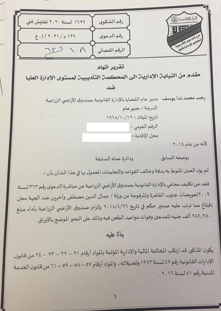 أكد تقرير الإتهام أن رجب محمد ندا، مدير عام القضايا بالإدارة القانونية بصندوق الأراضي الزراعية التابع لهيئة الإصلاح الزراعي خلال الفترة من عام 2019 حتى انتهاء التحقيقات لم يؤد العمل المنوط به بدقة وخالف القواعد والتعليمات المعمول بها في هذا الشأن