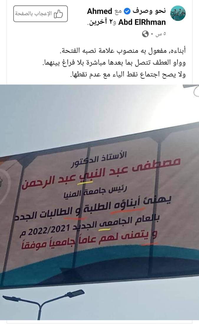 وشملت التعليقات المنتقدة للافتة، «# معالي_الوزير الدكتور رئيس جامعة المنيا لا يصح.. ولا يليق أن تنسب هذه اللافتة لسيادتكم أبناءه، مفعول به منصوب علامة نصبه الفتحة. وواو العطف تتصل بما بعدها مباشرة بلا فراغ بينهما، ولا يصح اجتماع نقط الياء مع عدم نقطها».