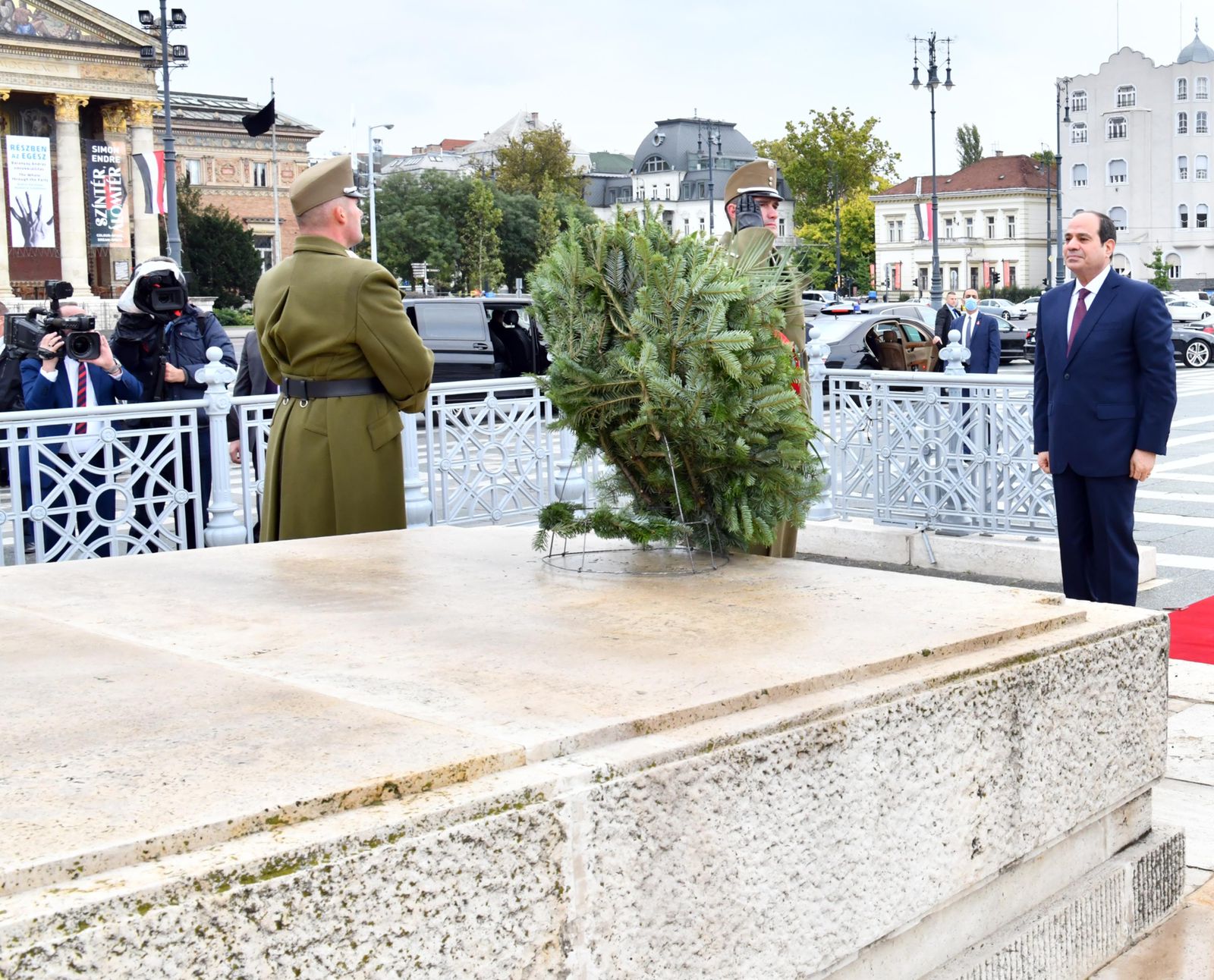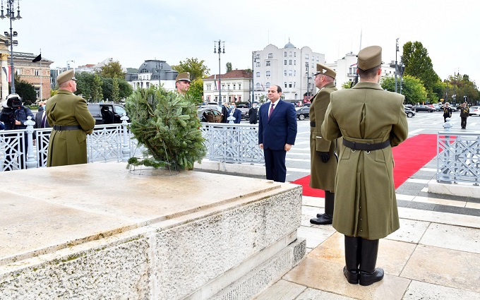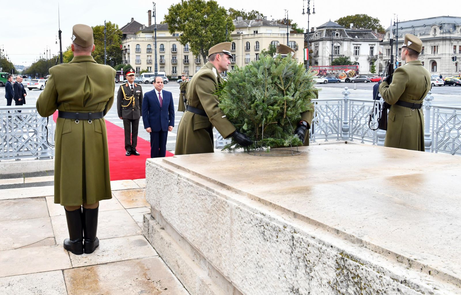 قال السفير بسام راضي المتحدث الرسمي باسم رئاسة الجمهورية إن الرئيس عبد الفتاح السيسي وضع إكليلا من الزهور بالنصب التذكاري بميدان الأبطال بالعاصمة بودابست.