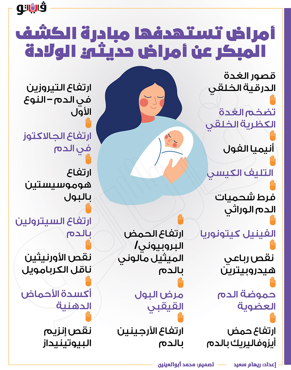 أمراض تستهدفها مبادرة الكشف المبكر عن أمراض حديثي الولادة الجمعة 15/أكتوبر/2021 - 03:39 م 10/15/2021 3:39:54 PM فحص حديثي الولادة ريهام سعيد شارك طباعة 18 حجم الخط شارك طباعة حديثى الولادة أنيميا الفول قصور الغدة الدرقية أمراض وراثية الأمراض الاحماض الدهنية الكشف المبكر الفينيل كيتونوريا الامراض الوراثية
