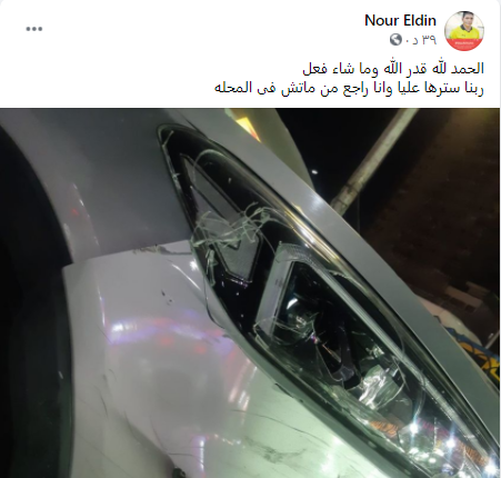 ونشر إبراهيم نور الدين، صورة عبر حسابه على فيس بوك وعلق "الحمد لله قدر الله وما شاء فعل ربنا سترها عليا وأنا راجع من ماتش فى المحلة".