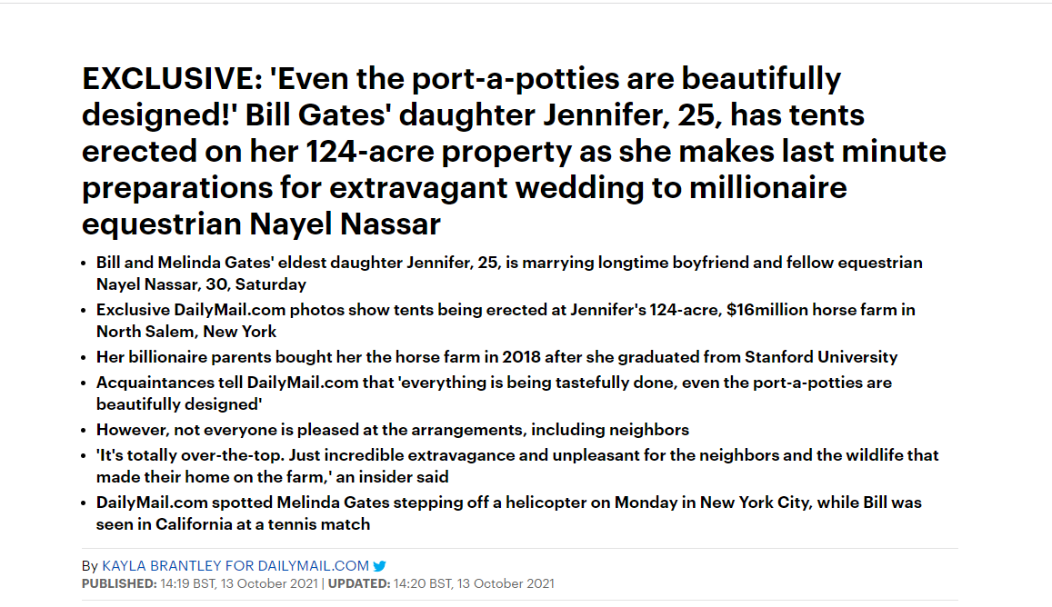 وكان بيل جيتس، دفع في 2018 أكثر من 16 مليون دولار ليشتري المزرعة البالغة مساحتها 50 هكتارا بأرياف مقاطعة Westchester في ولاية نيويورك، أي تقريبا 500 ألف متر مربع، وقدمها هدية قبل عام لابنته، لمناسبة تخرجها بعلم الأحياء البشري من جامعة Stanford University التي تخرج فيها خطيبها في 2013 بالاقتصاد، علما أنه ملم بالعربية والإنجليزية والفرنسية والألمانية، ويحمل الجنسيتين المصرية والأمريكية.