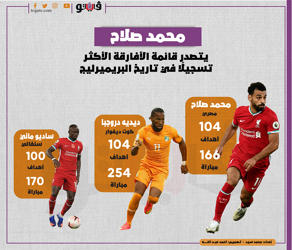 محمد صلاح يتصدر قائمة الأفارقة الأكثر تسجيلًا في تاريخ البريميرليج|إنفوجراف الأحد 17/أكتوبر/2021 - 12:12 م 10/17/2021 12:12:59 PM محمد صلاح محمد سيد شارك طباعة 18 حجم الخط شارك طباعة ليفربول الدوري الانجليزي محمد صلاح ساديو ماني تشيلسي البريميرليج دروجبا ديديه دروجبا السنغالي ساديو ماني