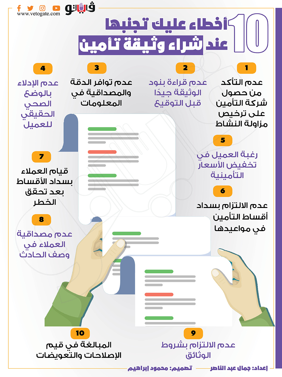10 أخطاء عليك تجنبها عند شراء وثيقة تأمين | انفوجراف الأحد 17/أكتوبر/2021 - 10:20 ص 10/17/2021 10:20:44 AM التأمين على السيارات جمال عبدالناصر شارك طباعة 18 حجم الخط شارك طباعة التامين أسعار التأمين أقساط التأمين