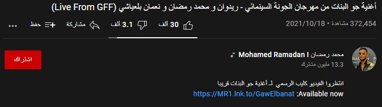 وكان محمد رمضان قدم أغنية جو البنات للمرة الأولى يوم الخميس الماضي في حفل افتتاح مهرجان الجونة السينمائي في دورته الخامسة.