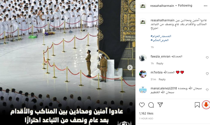 حرصت الصفحة الرسمية لرئاسة شئون الحرمين بالمملكة العربية السعودية، على الاحتفاء بعودة المصلين إلى المحاذاه بعد عام ونصف العام من تطبيق اجراءات التباعد الإجتماعى تنفيذًا للإجراءات الاحترازية لعدم الإصابة بفيروس كورونا المستجد، حيث نشرت الصفحة عدد من الصور للمصلين وهم يقفون بجوار بعضهم البعض بدون مسافات، عبر موقع انستجرام.