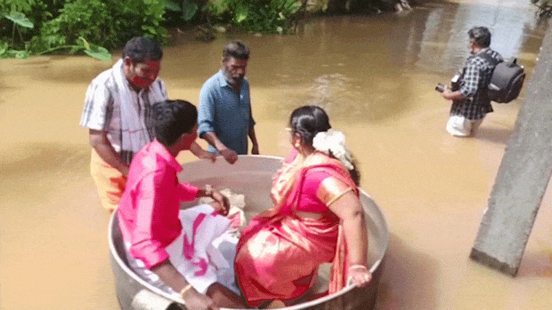 وأفادت وكالة الأنباء المحلية "PTI" بأن الزوجين، العاملين في مجال الرعاية الصحية في مستشفى تشينجانور، استعارا القدر من معبد محلي، مشيرين إلى أنه "الخيار الوحيد" الذي كان متاحا خلال أسرع وقت، حيث لم تردعهما الفيضانات والانهيارات الأرضية الناجمة عن الأمطار الغزيرة التي قتلت ما لا يقل عن 27 شخصا في جميع أنحاء الولاية، عن تأجيل يومهما الكبير.