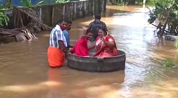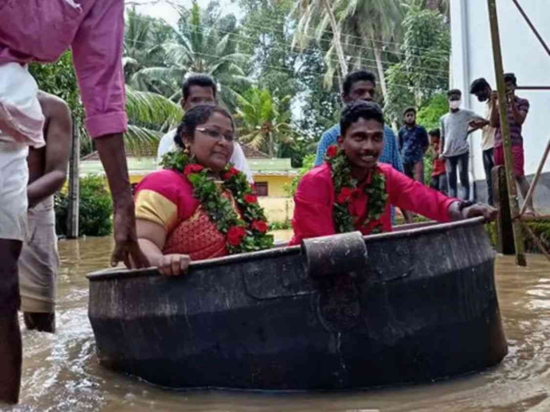 جاب عروسان هنديان شوارع غمرتها المياه، بسبب الفيضانات في ولاية ”كيرالا“ جنوب الهند، داخل إناء طهي ضخم، الإثنين؛ للوصول إلى مكان زفافهما، إثر هطول أمطارغزيرة تسببت في الفوضى بولاية كيرالا الجنوبية.