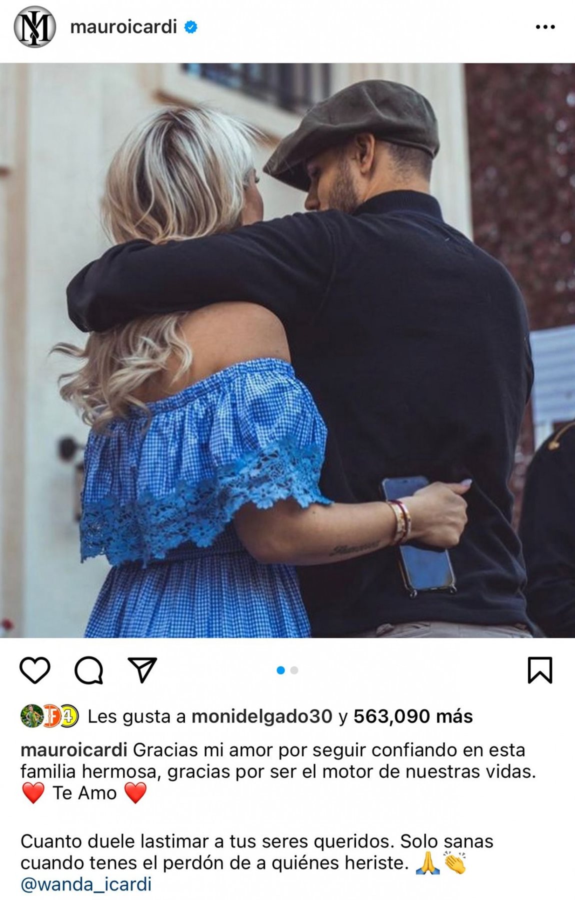 أرسل المهاجم الأرجنتيني ماورو إيكاردي رسالة عاطفية وشكرا لزوجته واندا نارا على استمرار ثقتها في العائلة؛ ما يؤكد أن الثنائي تصالحا بعد فترة صعبة نتيجة خيانته لها.