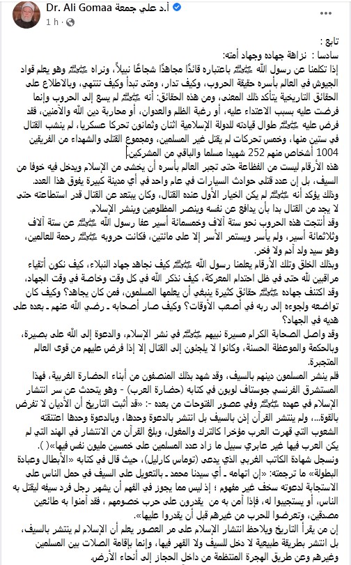 وكتب الدكتور على جمعة تدوينة على الفيس بوك قال فيها: "سادسا: نزاهة جهاده وجهاد أمته: إذا تكلمنا عن رسول الله ﷺ باعتباره قائدًا مجاهدًا شجاعًا نبيلًا، ونراه ﷺ وهو يعلم قواد الجيوش في العالم بأسره حقيقة الحروب، وكيف تدار، ومتى تبدأ وكيف تنتهي، وبالاطلاع على الحقائق التاريخية يتأكد ذلك المعنى، ومن هذه الحقائق: أنه ﷺ لم يسع إلى الحروب وإنما فرضت عليه بسبب الاعتداء عليه، أو رغبة الظلم والعدوان، أو محاربة دين الله والآمنين"
