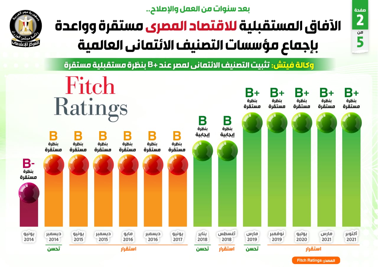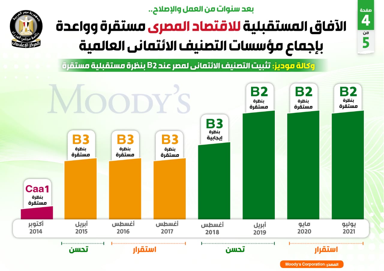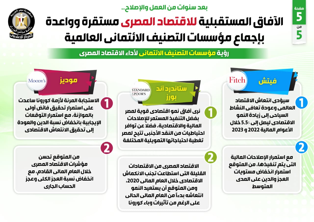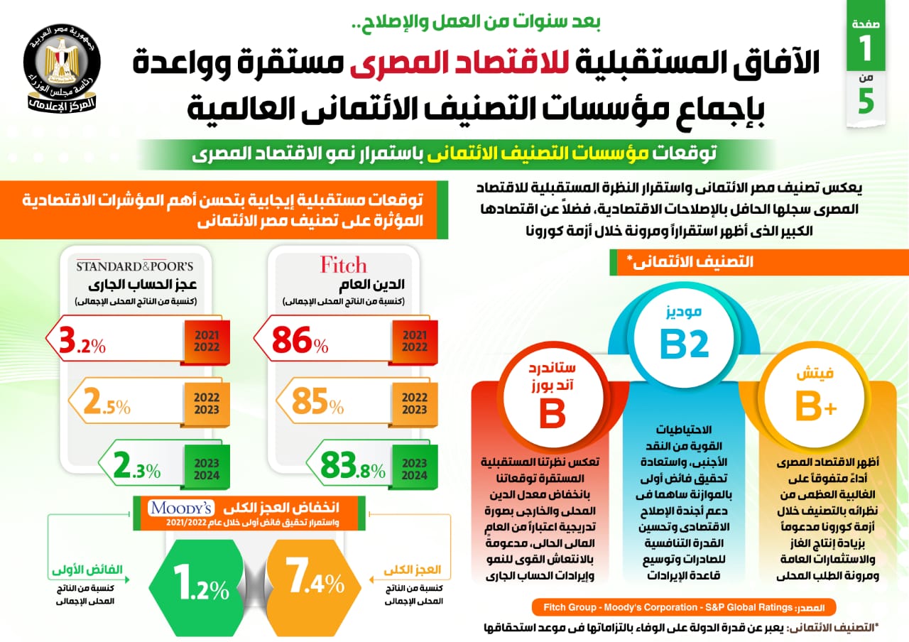 وفي هذا الصدد نشر المركز الإعلامي لمجلس الوزراء تقريرًا تضمن إنفوجرافات تسلط الضوء على إجماع مؤسسات التصنيف الائتماني على الآفاق المستقبلية المستقرة والواعدة للاقتصاد المصري، وذلك بعد سنوات من العمل والإصلاح.