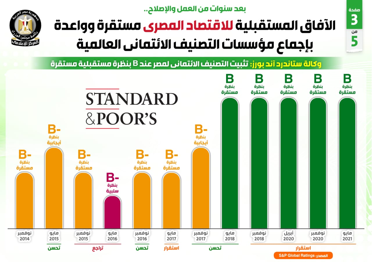 وفي سياق متصل، رصد التقرير أيضًا تطور رؤية ستاندرد آند بورز للتصنيف الائتماني لمصر منذ 2014، لافتًا إلى تثبيتها للتصنيف الائتماني عند B بنظرة مستقبلية مستقرة وذلك في مايو 2021، لتحتفظ بنفس المستوى منذ مايو 2018.