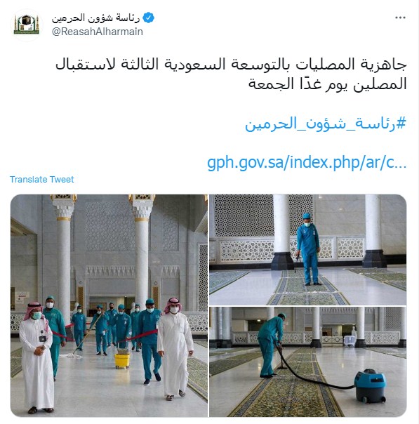 يذكر أن رئاسة شئون الحرمين لاستقبال المصلين بالمسجد الحرام والمسجد النبوي، في أول صلاة جمعة بدون تباعد جسدي، حيث يتم فتح 50 بابًا للدخول والخروج من الحرمين، وتم تخصيص أكثر من 4 آلاف عامل وعاملة لنظافة وغسيل الحرمين، التي تصل إلى 10 مرات يوميًا، بحسب موقع صحيفة "اليوم" السعودية.