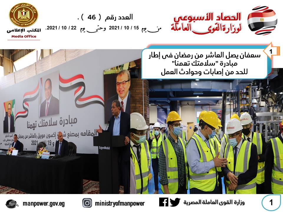 شهد حصاد الأسبوع الحالي، في وزارة القوى العاملة العديد من الأحداث المهمة خلال الفترة - من 15 إلى 21 أكتوبر الجاري- منها زيارة وزير القوى العاملة بمدينة العاشر من رمضان يرافقه محافظ الشرقية، وتفقد إحدى شركات إنتاج الزيوت "إكسون موبيل مصر" ، وافتتاح ندوة مبادرة "سلامتك تهمنا" بالشركة، وتوفير 1406 فرصة عمل للذكور والإناث، منها لذوي الهمم والعزيمة من خلال 64 شركة في 11 محافظة، وتعيين 4 آلاف و983 شابا في 6 محافظات، وتحصيل 3 ملايين جنيه مستحقات العمالة المصرية بالأردن، و10.5 مليون ليرة لبنانية تنازلات عن الكفالة البنكية لـ 7 مصريين.