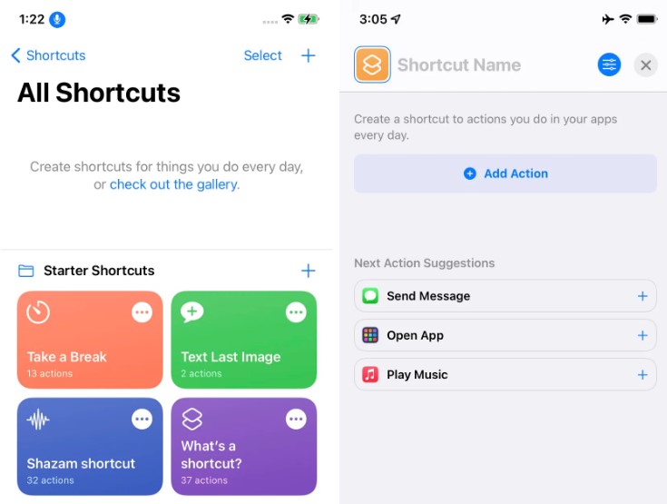 3- بمجرد دخولك إلى التطبيق، انقر على علامة "زائد" في الزاوية العلوية اليمنى، واكتب اسم الاختصار الجديد، ثم اضغط على Add Action.