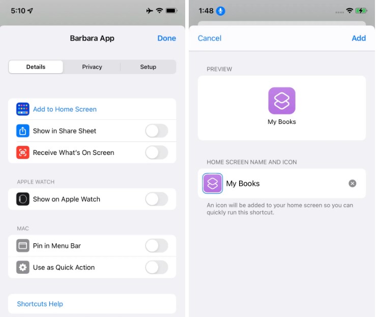 10- سيظهر الآن رمز الأيقونة الجديدة، ويمكنك اختيار اسم للرمز، ثم اضغط على إضافة في الزاوية اليمنى العليا ليظهر على الشاشة الرئيسية.