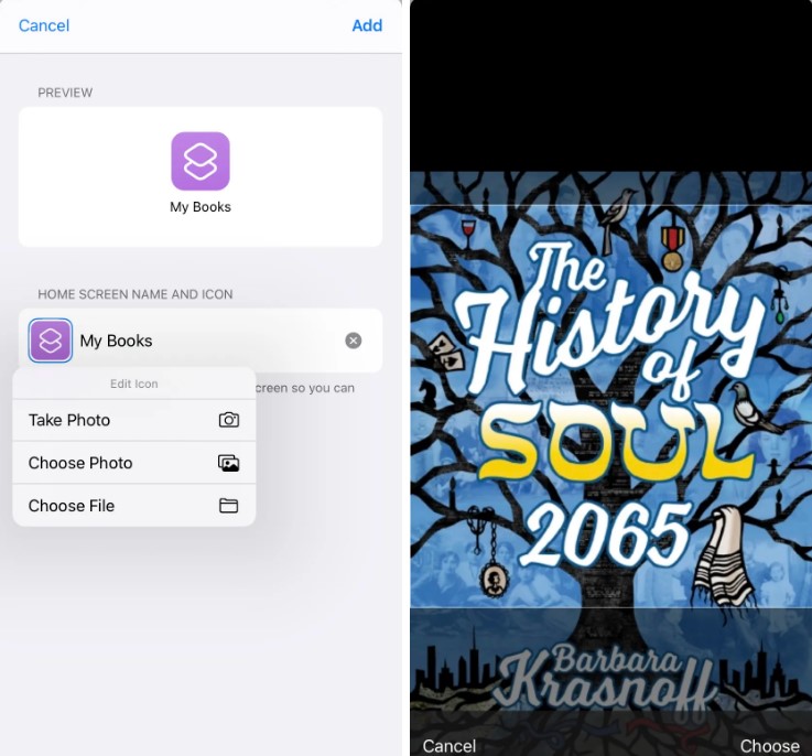 9- اضغط على الأيقونة الموجودة في الأسفل Home Screen Name and Icon "اسم الشاشة الرئيسية والرمز"، وسيظهر خيار إما التقاط صورة أو اختيار صورة أو اختيار ملف، وفي حالة حفظ صورة سابقًا يمكن اختيار صورة وتحديدها، وستحدد منطقة مميزة وهي الرمز ويمكن تحريكه للوصول للقسم المناسب ثم اضغط على "اختيار" في الزاوية اليمنى السفلى.