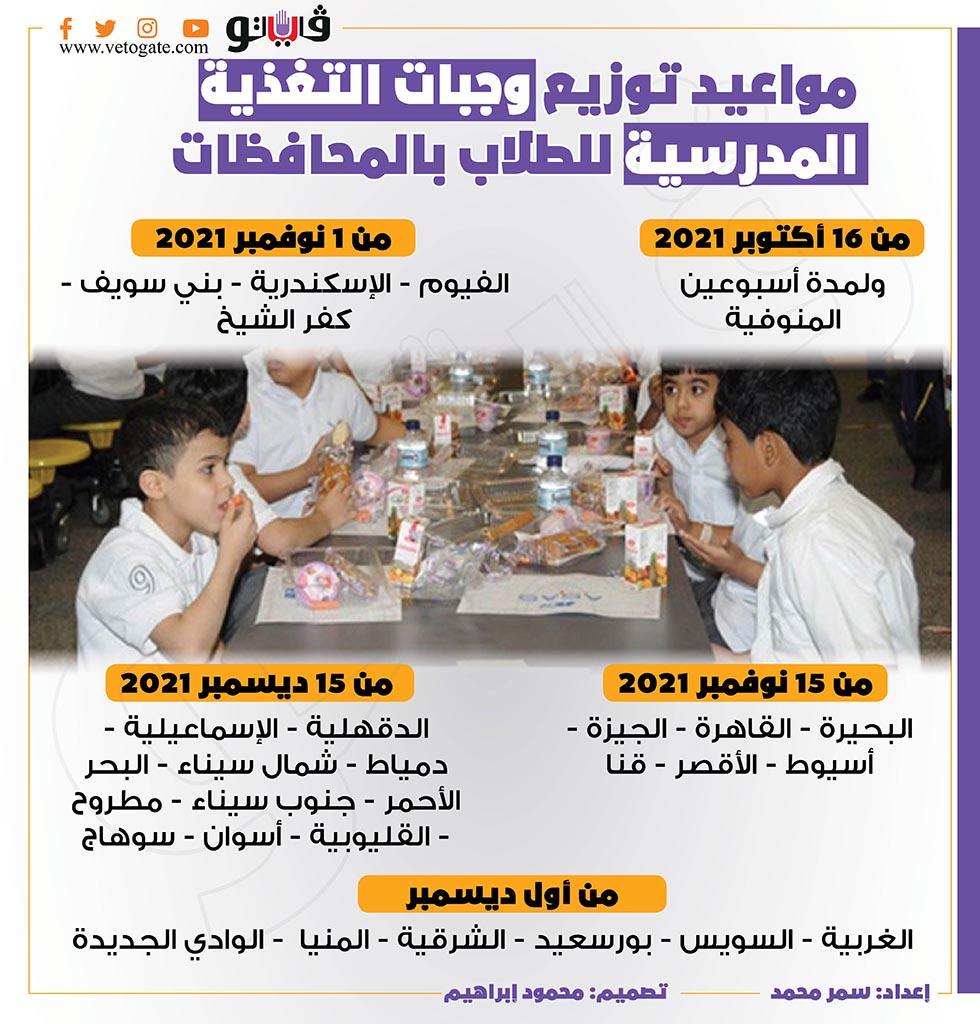 مواعيد توزيع وجبات التغذية المدرسية للطلاب بالمحافظات | انفوجراف السبت 23/أكتوبر/2021 - 03:25 م 10/23/2021 3:25:11 PM وجبات التغذية المدرسية 2021 سمر محمد شارك طباعة 18 حجم الخط شارك طباعة صرف وجبات التغذية المدرسية وجبات التغذية المدرسية التغذية المدرسية منظومة التغذية المدرسية محافظة المنوفية