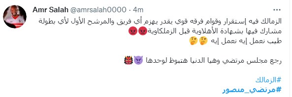 وعلق عمرو صلاح " الزمالك فيه إستقرار وقوام فرقه قوي يقدر يهزم أي فريق والمرشح الأول لأي بطولة مشارك فيها بشهادة الأهلاوية قبل الزملكاوية.. طيب نعمل إيه نعمل إيه.. رجع مجلس مرتضي... #الزمالك #مرتضي_منصور".