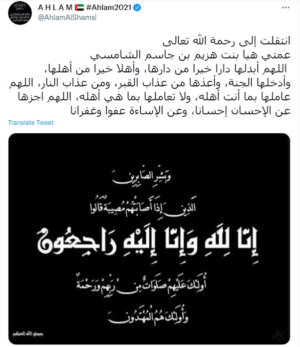 وكتبت أحلام على تويتر "انتقلت إلى رحمة الله تعالى عمتي هيا بنت هزيم بن جاسم الشامسي.. اللهم أبدلها دارا خيرا من دارها، وأهلا خيرا من أهلها، وأدخلها الجنة، وأعذها من عذاب القبر، ومن عذاب النار، اللهم عاملها بما أنت أهله، ولا تعاملها بما هي أهله، اللهم اجزها عن الإحسان إحسانا، وعن الإساءة عفوا وغفرانا".